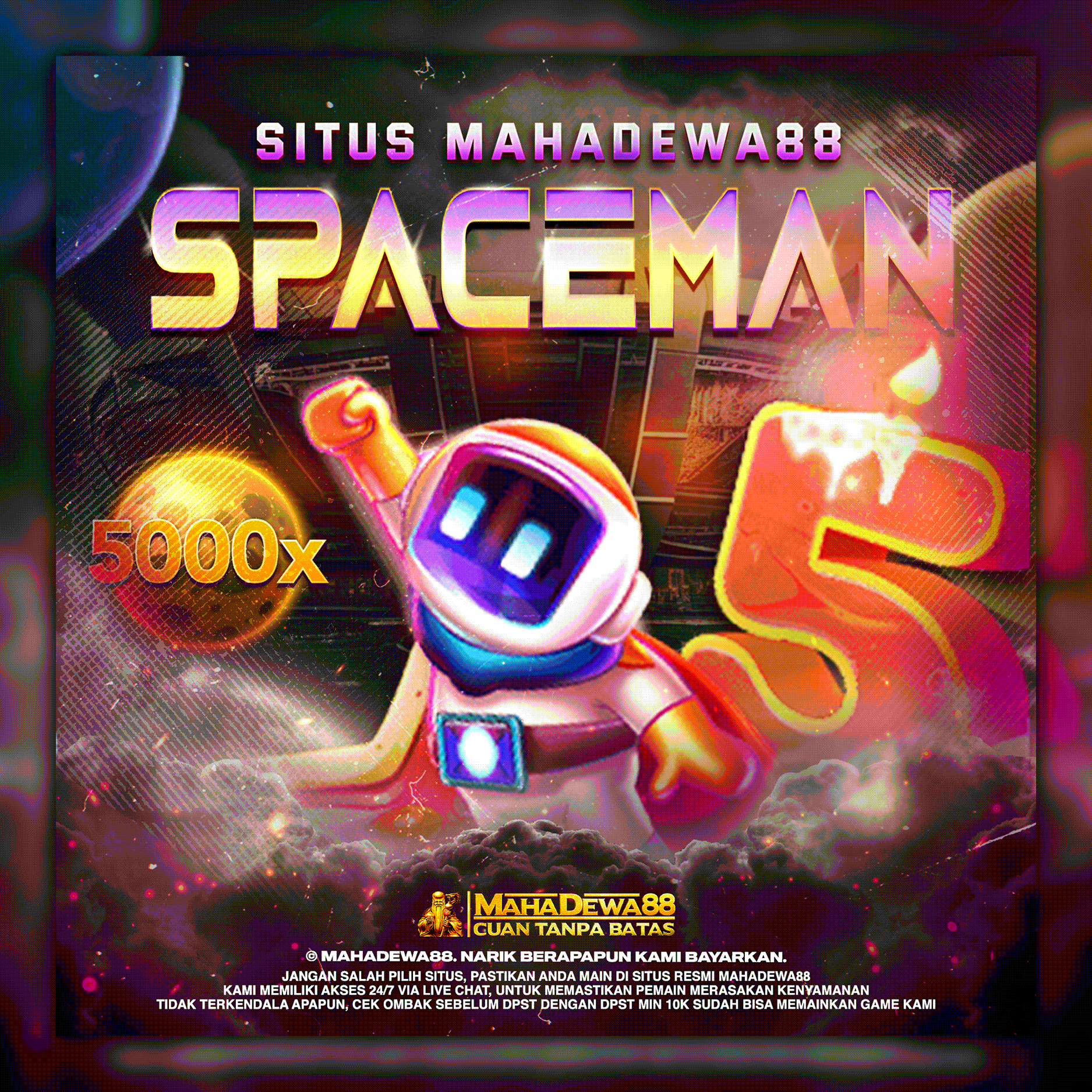 Hanya dengan 10k, Anda sudah bisa memasang taruhan SLOT ONLINE maupun semua jenis SPACEMAN di SPACEMAN via MAHADEWA88.